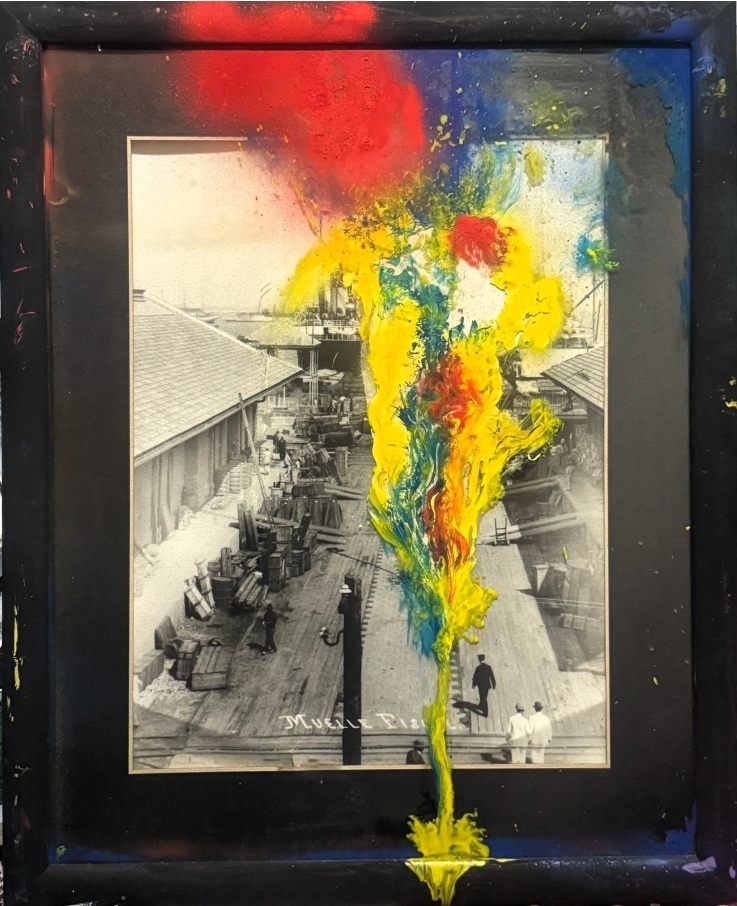 Sobre el cristal que la contiene, una explosión de colores primarios —azul, amarillo y rojo— irrumpe en la imagen monocromática, transformándola. El gesto no busca ocultar el deterioro, sino dialogar con él, resignificando la memoria desde el arte. El pasado ya no es estático: el color lo atraviesa, lo agita, lo reinterpreta. Así, lo que parecía perdido se convierte en una nueva forma de mirar.