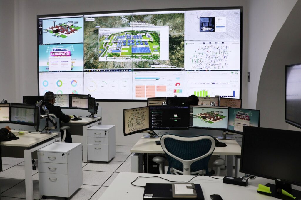 A través de un moderno videowall y del sistema SCADA (Supervisory Control and Data Acquisition), el personal especializado monitorea y controla las fuentes de abastecimiento, puntos de control, tanques, rebombeos, plantas potabilizadoras y plantas de tratamiento de aguas residuales, garantizando así la continuidad y calidad del servicio.