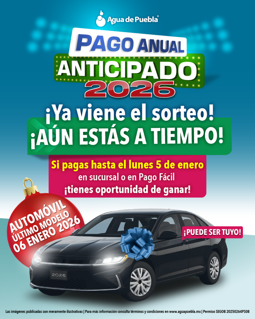 Agua de Puebla informa a los usuarios de los servicios de agua potable, drenaje y saneamiento que aún están a tiempo para participar en la primera rifa de un automóvil último modelo si realizan aún su Pago Anual Anticipado 2026 hasta este lunes 5 de enero, a las 18 horas en cualquiera de sus 11 sucursales o en línea hasta la media noche.