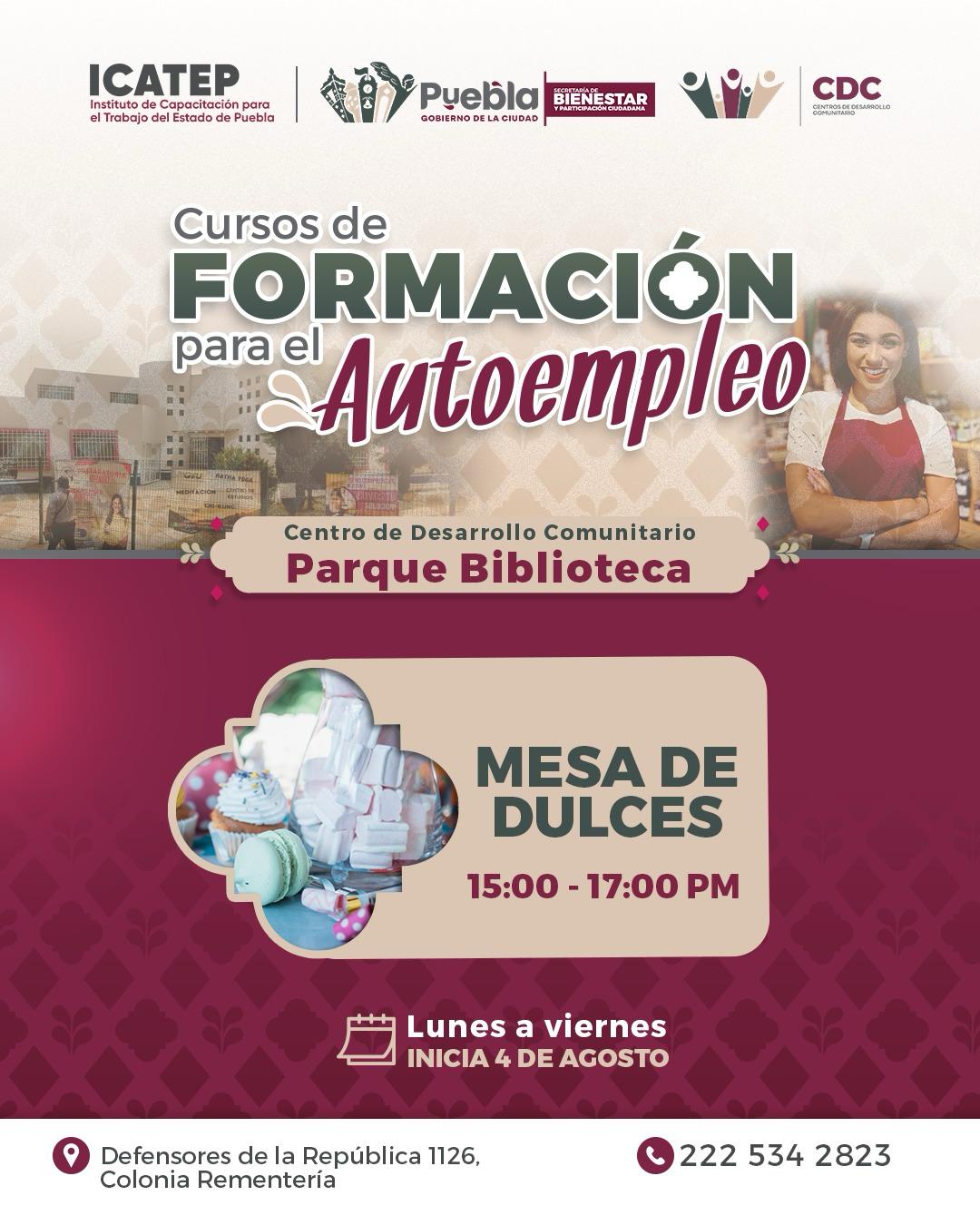 Como parte del compromiso del presidente municipal Pepe Chedraui de poner orden en la ciudad y generar oportunidades para el desarrollo económico, el Gobierno de la Ciudad invita a la ciudadanía a inscribirse en los cursos gratuitos de capacitación para el autoempleo que se realizarán en distintos Centros de Desarrollo Comunitario (CDC) y el Parque Biblioteca, en coordinación con el Instituto de Capacitación para el Trabajo del Estado de Puebla (ICATEP).