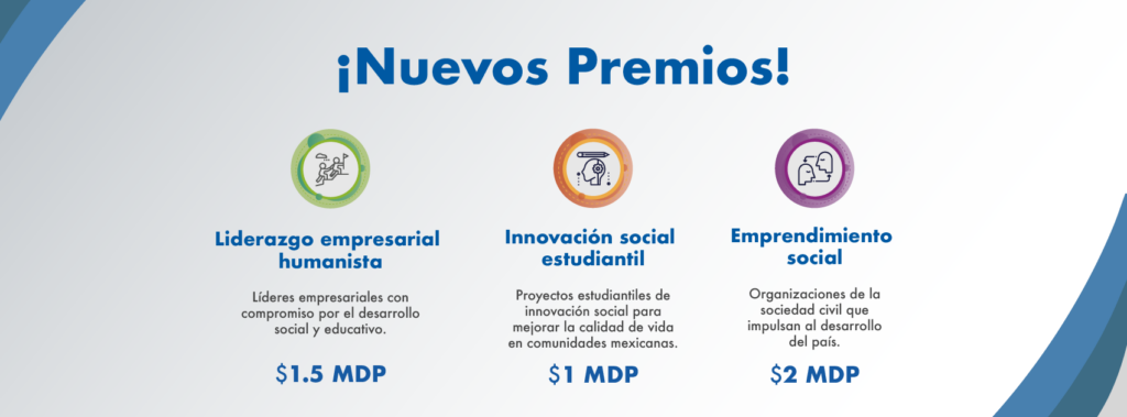 Innovación social estudiantil $1 millón de pesos, de los cuales, $500 mil se destinan a su proyecto y $500 mil para que vivan una experiencia internacional en un ecosistema emprendedor.