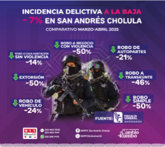 Lo anterior en seguimiento a los patrullajes coordinados que mantiene permanentemente la Policía Municipal con el Ejército Mexicano, la Guardia Nacional y la Policía Estatal en la Cabecera Municipal, inspectorías, juntas auxiliares y la Delegación Atlixcáyotl, el robo de vehículo registró una baja del 24%, en tanto se logró una disminución del 50% en extorsión, mientras que el robo a casa habitación con violencia bajó 14%.