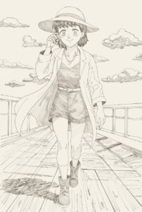 Su silueta, envuelta en un atuendo nuevo que resalta su figura de forma sutil y elegante, contrasta con la estructura firme del barco.