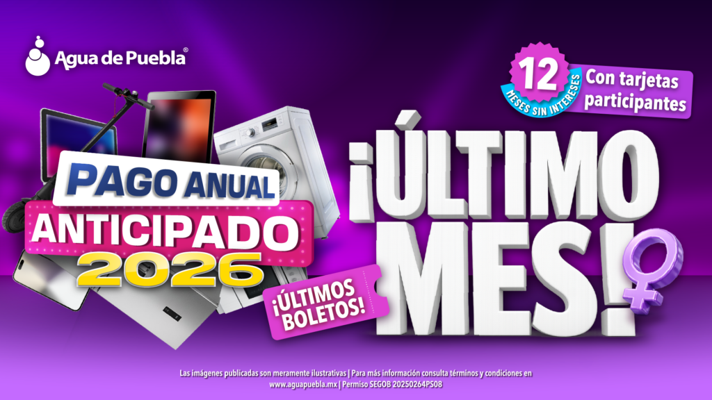 Puebla, Pue. 01 de marzo de 2026.- Agua de Puebla informa que en este mes de marzo se ofrece la última oportunidad para realizar el Pago Anual Anticipado 2026 y mantener las tarifas actuales vigentes para todo el año 2026.