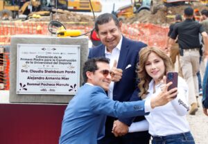 -El director de la Comisión Nacional de Cultura Física y Deporte (CONADE), Rommel Pacheco y el gobernador Alejandro Armenta encabezaron la colocación de la primera piedra de la Universidad del Deporte.