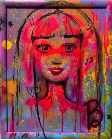 En esta pieza, un marco con cristal se convierte en soporte pictórico y metáfora: lo que normalmente encierra o protege la imagen, aquí se transforma en el escenario mismo de una crítica. La superficie tiene una combinación vibrante y dinámica que utiliza una combinación cuadrada de color, esta es una armonía cromática que utiliza cuatro colores equidistantes en el círculo cromático. Esta combinación forma un cuadrado perfecto al unir los colores en el círculo, y genera una paleta rica, variada y balanceada entre colores cálidos y fríos.