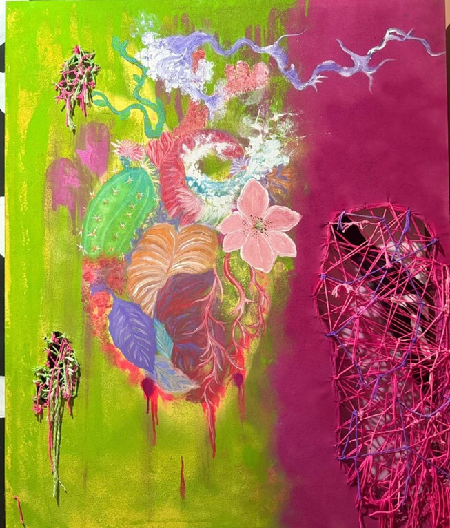Esta obra representa un corazón desde lo simbólico y lo natural. Su forma se construye con texturas orgánicas: flores, cactus y agua que conviven sobre un fondo de combinación complementaria con los colores verde y fucsia vibrante, como si la vida y la emoción brotaran desde dentro.