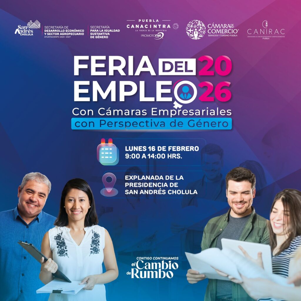 La presidenta municipal Lupita Cuautle, en conjunto con los presidentes de la Cámara de Comercio, Servicios y Turismo de Puebla (CANACO), Manuel Flores Fernández y de la Cámara Nacional de la Industria de Transformación Puebla (CANACINTRA), Carlos Julián Sosa Spínola, presentó la _“Feria del Empleo 2026 con Perspectiva de Género”.