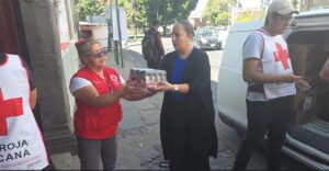 Mientras tanto en la Delegación de Cruz Roja Puebla, la Directora Ejecutiva de la FGCM, Maestra, Mayra Fritsche García, acudió a las oficinas para realizar la donación de las despensas que recibió la Licenciada Gisela Gutiérrez Ortíz, asistente de la delegada Paula Saukko de Murrieta
