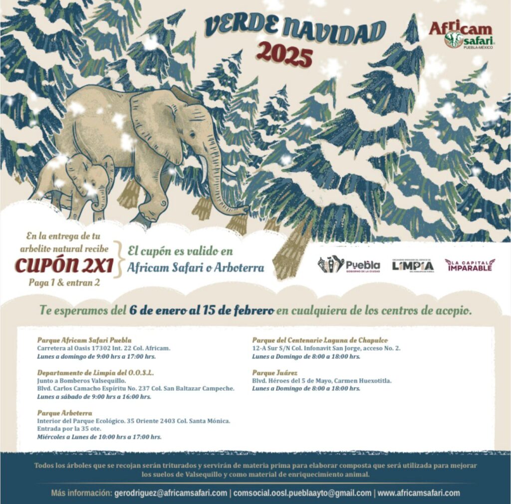 El parque Africam Safari y el Gobierno de la Ciudad de Puebla, encabezado por el presidente municipal, Pepe Chedraui, pusieron en marcha la Campaña Verde Navidad 2025, a través del Organismo Operador del Servicio de Limpia (OOSL), con el objetivo de fomentar el reciclaje de árboles naturales de Navidad y fortalecer el cuidado del medio ambiente.