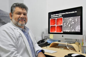 Luis Ramiro Caso Vargas, doctor en Biotecnología por el IPN, comentó que otra vertiente para la detección de Pseudomonas aeruginosa es un biosensor construido con nanopartículas de oro. “Este sistema es mucho más pequeño, incluso que la bacteria. En lugar de silicio, los biosensores están basados en nanoesferas de oro fluorescentes a las que igualmente se les adhiere un anticuerpo para atrapar al microorganismo en cuestión. Como los misiles teledirigidos, van directamente a las bacterias”.