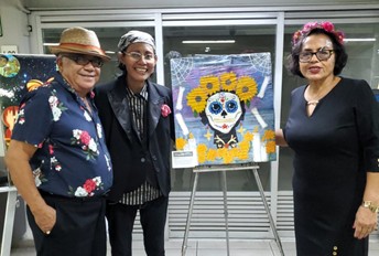 Sara Muñoz posa con su obra “Más allá de la muerte”, elaborada con una técnica mixta, acompañada por Nayo Mijangos y Yolanda López.