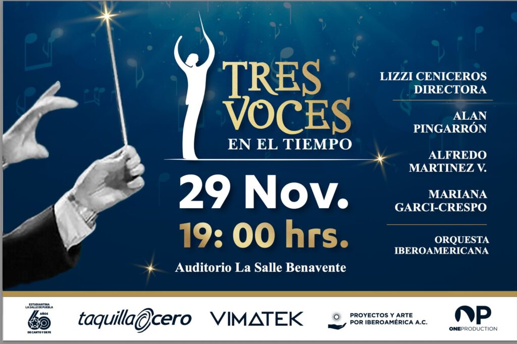 El sábado 29 de noviembre del presente año Lizzi Ceniceros regresa Puebla para dirigir el ya icónico y tradicional concierto “Tres Voces en el Tiempo”, producido por One Production MX a las 19:00 horas en el Auditorio La Salle Benavente y en el que precisamente tres extraordinarios cantantes internacionales acompañados por la Orquesta Iberoamericana, fundada y dirigida por la excelsa directora unen su talento a favor de la fundación “Una Nueva Esperanza” Asociación para Niños con Cáncer.