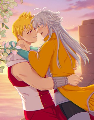 Título: Abrazo al atardecer – Tristán y Lancelot (comisión)