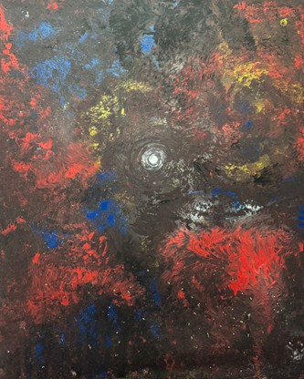 En esta obra, la forma desaparece para dar paso al color, la textura y la emoción. Los tonos rojizos, oscuros y azules se entrelazan con pinceladas sueltas, mientras un punto blanco en el espacio actúa como pausa, respiro o guía sutil.
