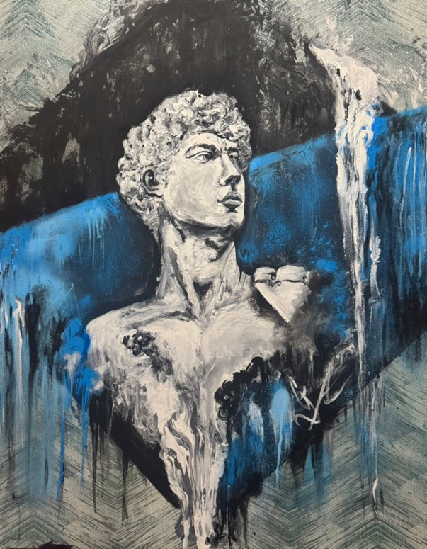 Inspirada en el busto de David de Miguel Ángel, esta obra no fue pintada con pinceles, sino con los dedos, como si el rostro masculino fuera esculpido directamente sobre la superficie. Cada trazo es una huella, una forma de modelar la belleza idealizada desde el cuerpo que crea. Complementando este concepto con el color azul refleja una masculinidad introspectiva, pensante y estable.