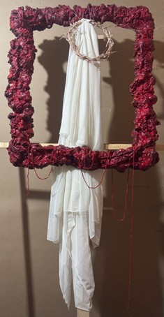 Un marco como herida abierta. Sangre, piel, dolor. En el centro, un manto blanco y una corona de espinas: símbolos de pureza y tortura.