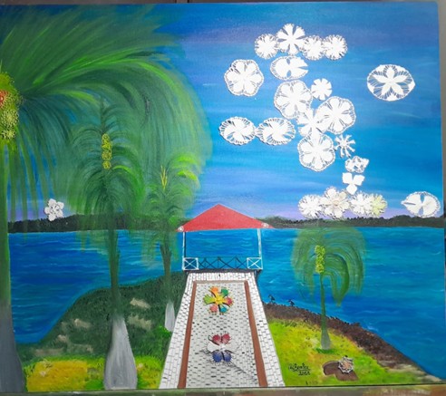 Técnica: óleo doble lienzo con aplicaciones de tejido de ñandutí