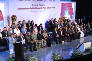 Ante más de mil 300 personas, la subsecretaria de Construcción de Paz, Participación Social y Asuntos Religiosos, de la Secretaría de Gobernación del Gobierno de México, Rocío Bárcena Molina, acompañada por el gobernador Alejandro Armenta, tomó protesta al Consejo Estatal y a los Municipales de Paz y Justicia Cívica, donde reconoció el trabajo del mandatario estatal al señalar que “habla con la verdad y con acciones. Le doy un aplauso, gracias por su ética».