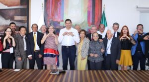 Estuvo flanqueado por el Secretario de Gobernación, Samuel Aguilar Pala; el Coordinador General de Comunicación y Agenda Digital, José Tomé Cabrera y la Directora de SICOM, Natalie Hoyos López; José Manuel Martínez, Subcoordinador de Comunicación Social y Michelle Talavera Herrera, Directora de Convenciones y Parques.
